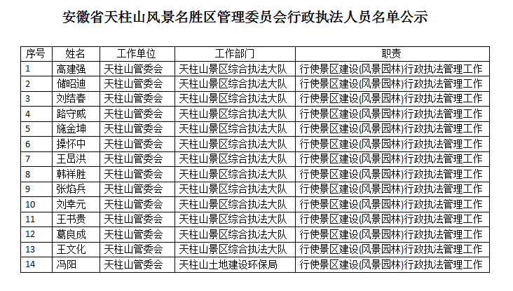 安徽省天柱山風(fēng)景名勝區(qū)管理委員會(huì)行政執(zhí)法人員名單公示